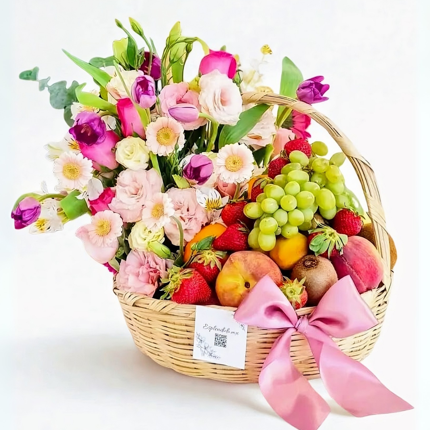 Una canasta llena de frutas frescas, acompañada de vibrantes tulipanes, delicadas mini flores, elegantes lisiantus, alegres mini gerberas y clásicas rosas, creando un festín visual y frutal.