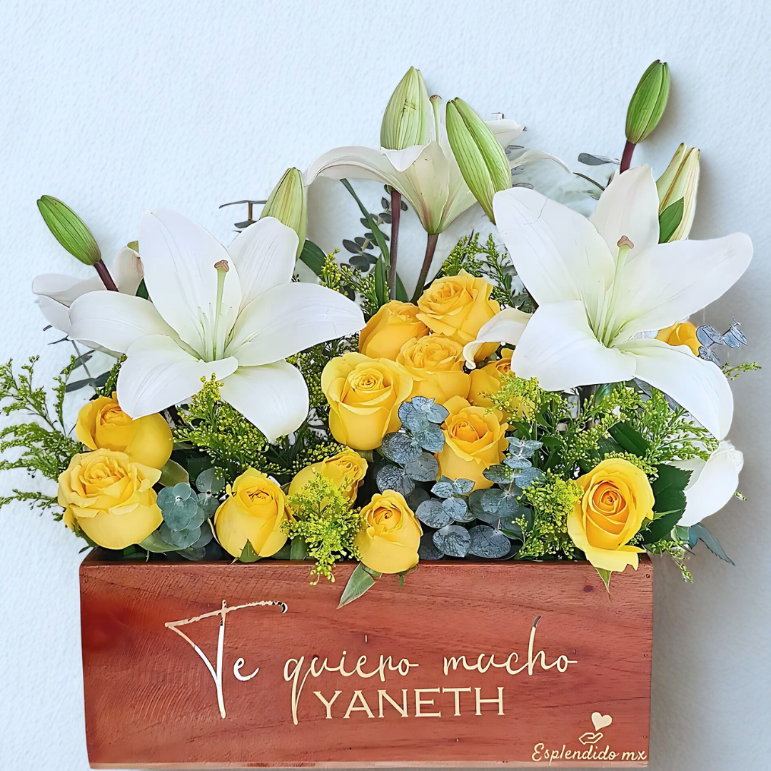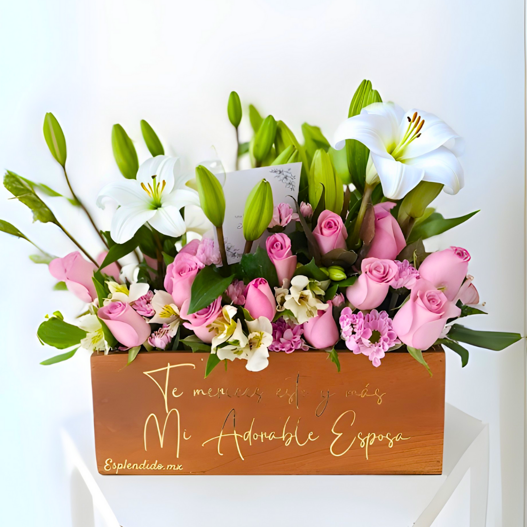 Hermoso arreglo de rosas, Lilis y astromelias, en caja de madera personalizada.
