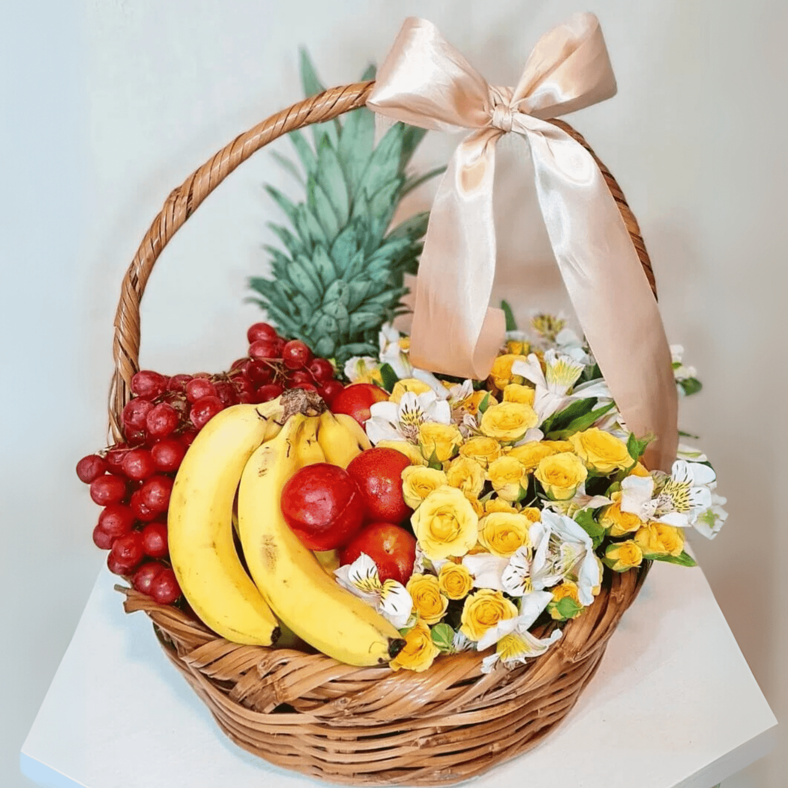 Canasta de 5 variedades de frutas + minirosas y astromelias, decorada con listón.