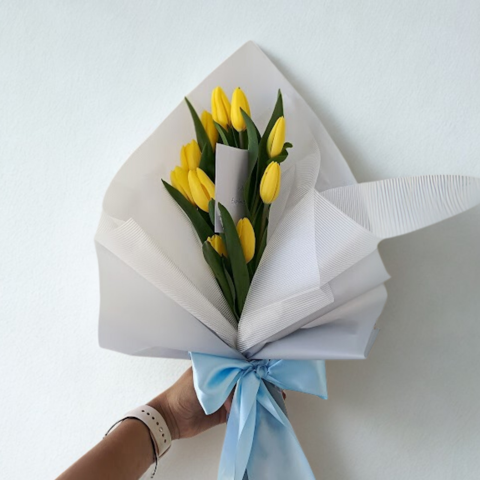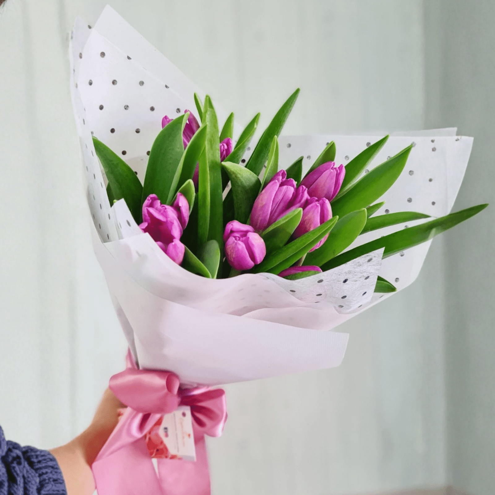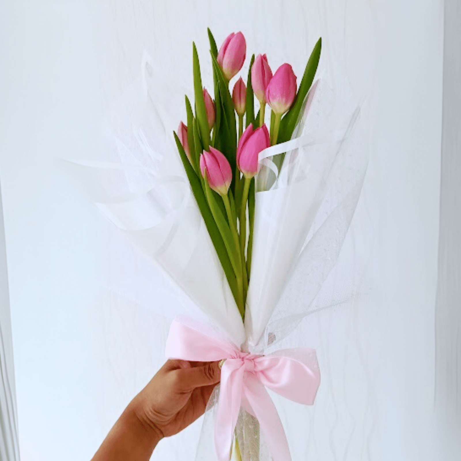 Ramo de 10 tulipanes, decorado con papel especial y listón.