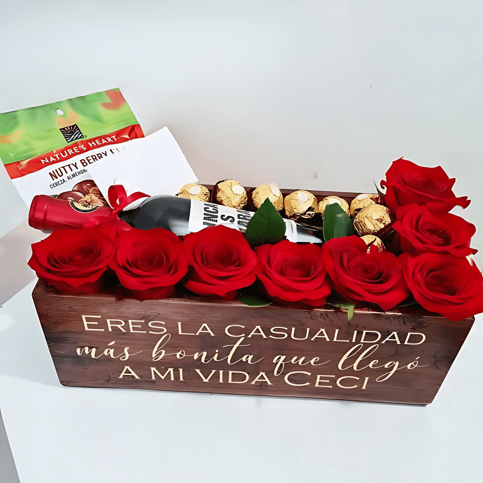 Una hermosa caja de madera decorada con rosas, chocolates, frutos secos, mensaje en vinil y un exquisito vino para obsequiar a esa persona especial.