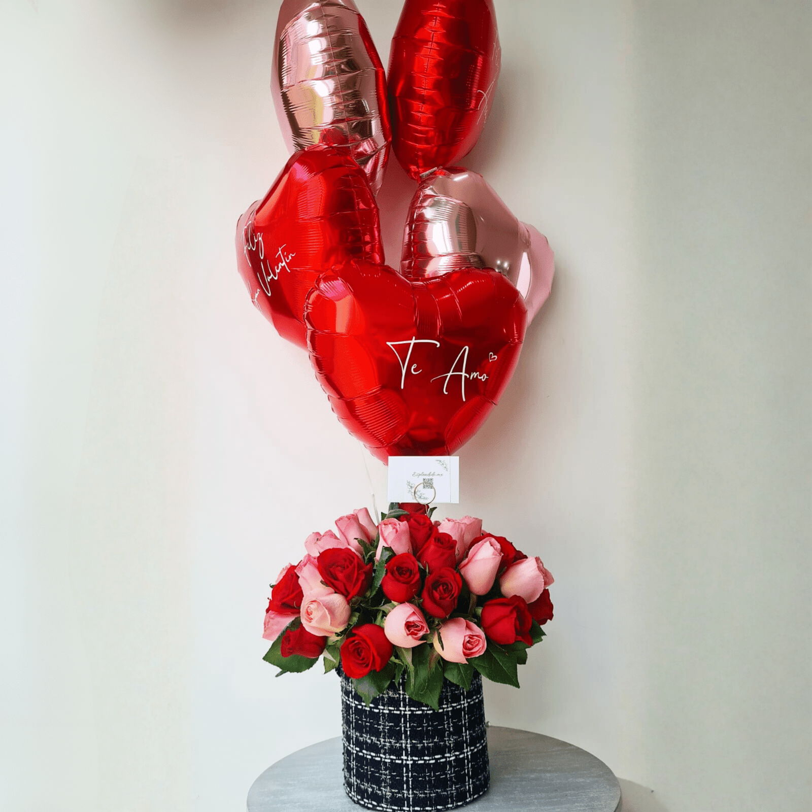 Arreglo premium con 50 Rosas complementado por un vibrante bouquet de 5 Globos de Helio, incluyendo 3 personalizados. Es la máxima expresión de lujo y celebración.