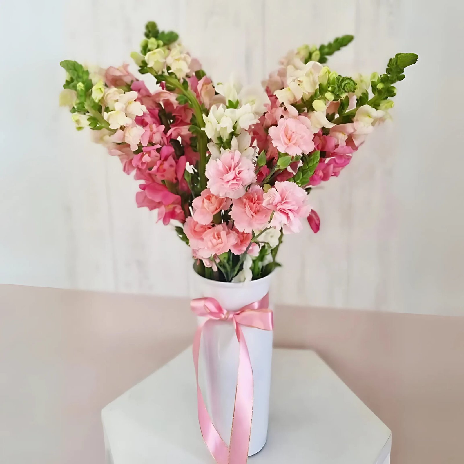 Hermoso arreglo de fino follaje en tonos blanco y rosa pastel, en base de cristal color blanco o transparente.