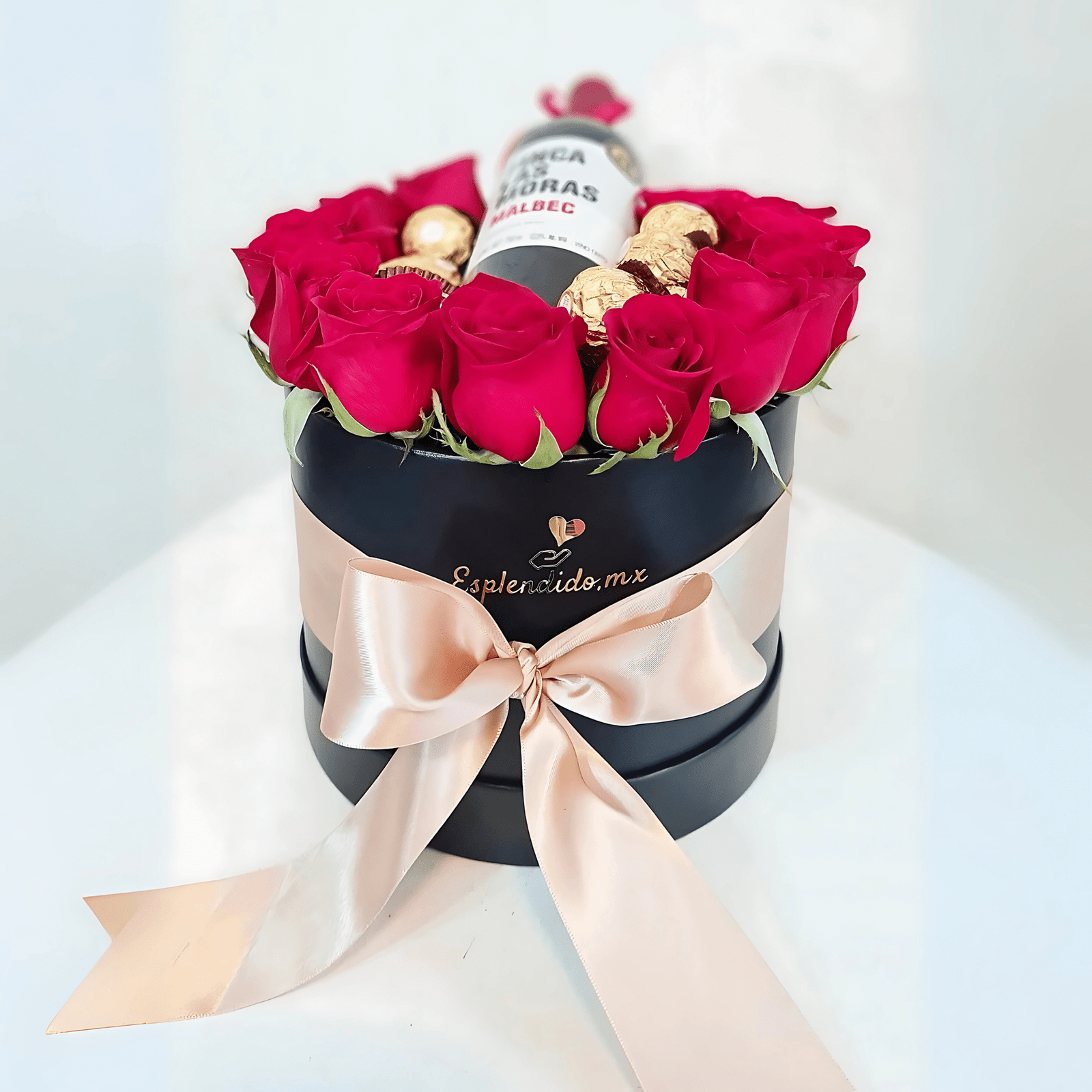 Elegante caja con aprox 24 rosas premium, decorada con listón. Acompañada de chocolates y vino tinto.