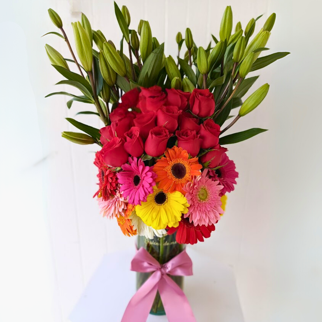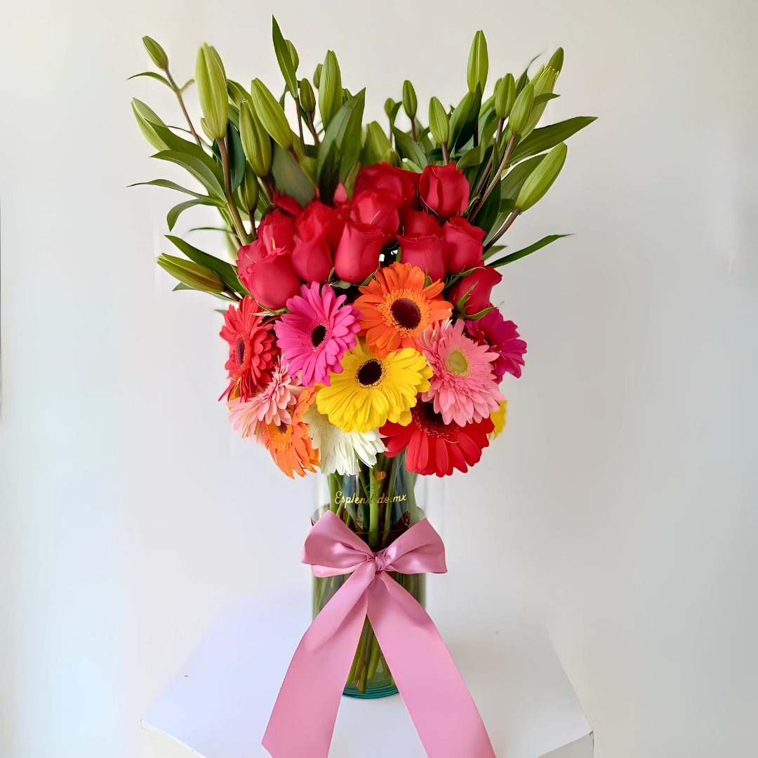 Hermoso y alto arreglo de lilis, 10 gerberas y 24 rosas en base de cristal, decorado con listón 😀