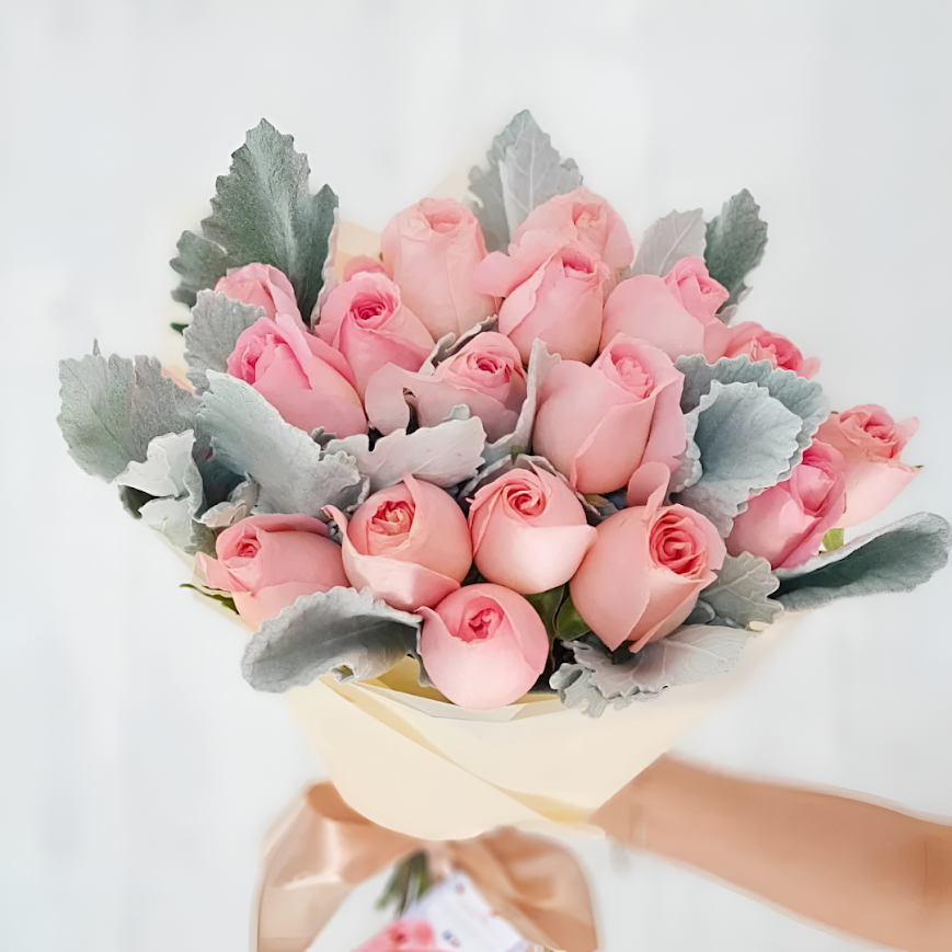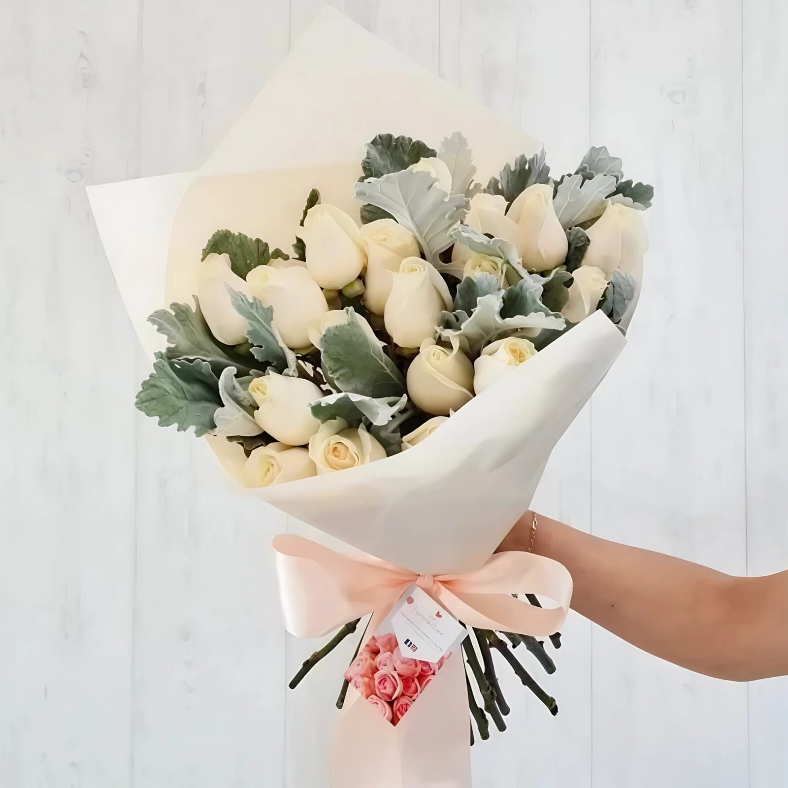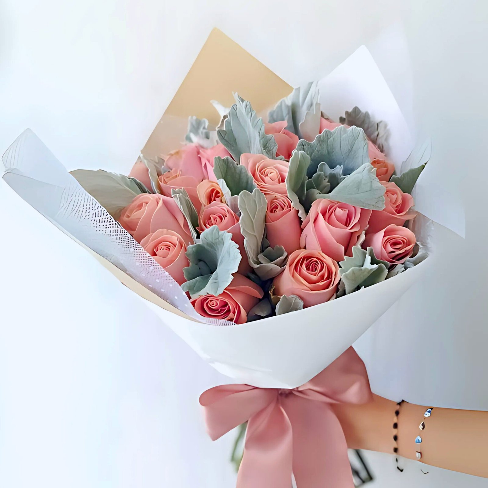 Un detalle que no puedes dejar pasar, ramo de 24 rosas premium complementado con fino follaje.