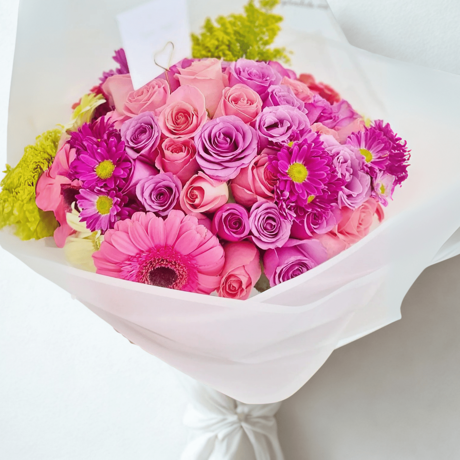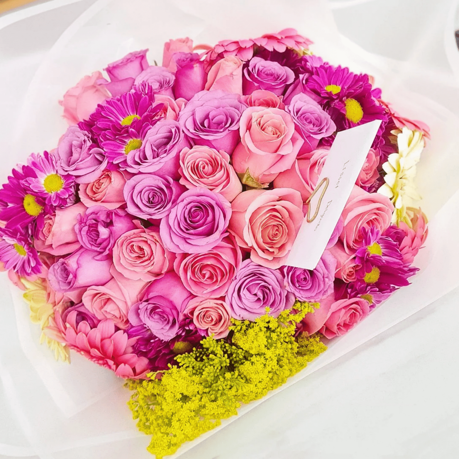 Ramo de 50 rosas y 10 gerberas complementado con hermosas flores y follajes en tonos morado, rosa, blanco y verde lima.